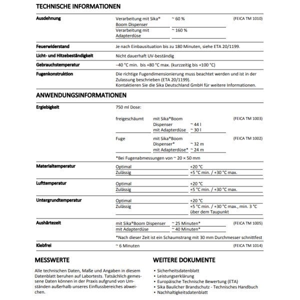 Merkmal Wert Produktart Brandschutzschaum Basis 1-K-Polyurethan Feuerwiderstand bis 180 Minuten (ETA 20/1199) Aushärtung ca. 25 – 40 min Temperaturbeständigkeit −40 °C bis +80 °C Dichte ca. 30 kg/m³ Verarbeitungstemperatur +5 °C bis +30 °C Lagerzeit ca. 12 Monate Farbe Pink Artikelnummer 04-0420-0750 GTIN 7612895552644 Kategorie Brandschutzschaum Hersteller Sika Artikelgewicht 1,15 kg Versandgewicht 1,15 kg Inhalt 750 ml
