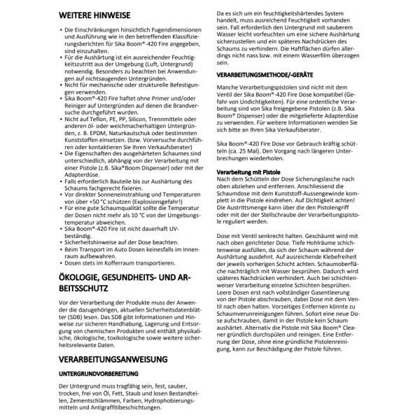 Der Sika Boom-420 Fire ist ein selbstexpandierender, feuerwiderstandsfähiger 1-K-PU-Schaum, entwickelt für den professionellen Einsatz in brandschutzqualifizierten Wand- und Bodenfugen.