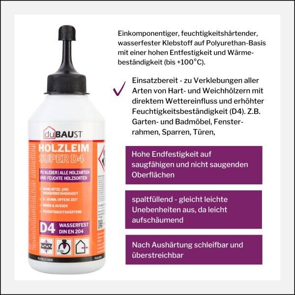 Der duBAUST SUPER D4 Holzleim ist ein gebrauchsfertiger, einkomponentiger Klebstoff auf Polyurethanbasis (1K-PU) mit maximaler Wasserfestigkeit (D4 gemäß EN 204) und hoher Wärmebeständigkeit bis +100 °C.